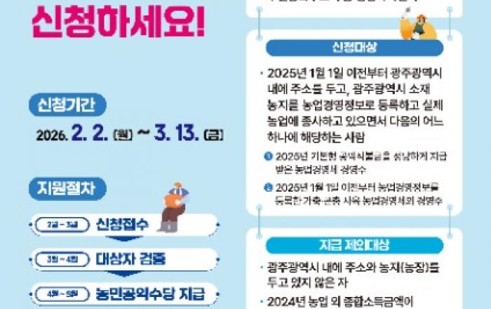 광주광역시(시장 강기정)는 ‘2026년 농민공익수당’ 신청·접수를 2월 2일부터 3월 13일까지 주소지 관할 동 행정복지센터에서 진행한다.광주시는 농자재값 상승, 일손 부족 등으로 어려움을 겪고 있는 농업인들에게 실질적인 도움을 주기 위해 올해 농민공익수당 신청·접수