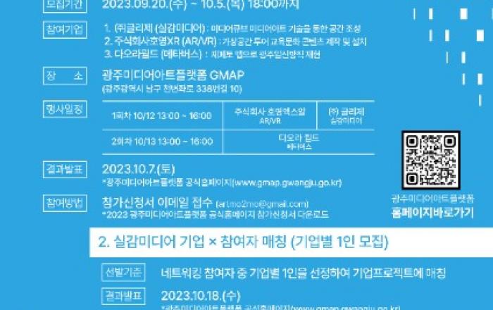 광주광역시(시장 강기정)는 10월 예정된 ‘2023 광주미디어아트페스티벌’(GMAF)에 앞서 미디어기업과 광주시민이 함께 미디어콘텐츠를 제작하는 ‘2023 GMAF 매칭페어’를 진행한다. ‘2023 GMAF 매칭페어’는 ▲실감미디어 ▲증강현실(AR)·가상현실(VR) ▲