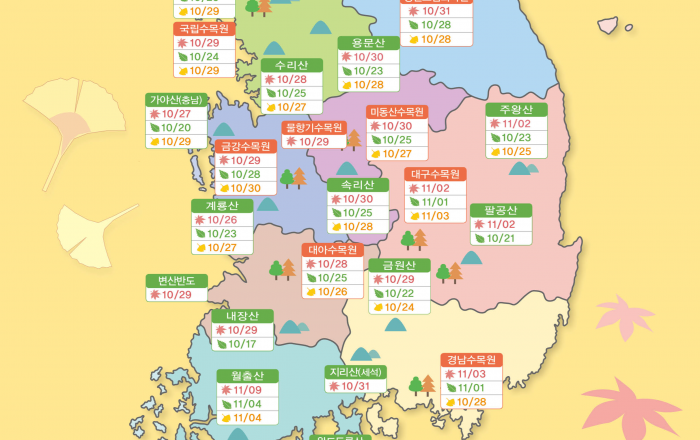산림청은 25일 ‘2023년도 가을 단풍(절정) 예측지도’를 발표하였다. 올 단풍 절정 시기는 지역과 수종에 따라 다소 차이가 있겠으나, 대부분 10월 하순부터 11월 초로 예상되며, 수종별 단풍 절정 시기의 평균일은 당단풍나무(10월 2