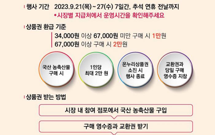 오는 21일부터 27일까지 전통시장에서 농축수산물을 사면 구매 금액의 최대 30~40%를 온누리상품권으로 돌려받을 수 있다. 농림축산식품부·해양수산부·중소벤처기업부는 농축수산물 소비자 물가 안정을 위해 추석맞이 전통시장 온누리상품권 현장 환급행사를 공동 개최한다고 20