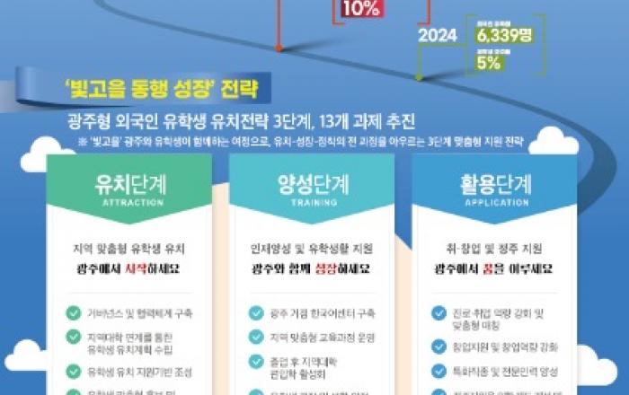 광주시가 올해부터 5년간 총사업비 258억5000만원을 투입해 외국인 유학생 1만2000명시대를 연다.광주광역시(시장 강기정)는 ‘외국인 유학생 종합지원계획’(2025년~2029년)을 수립, 시행한다.이 계획은 급격한 학령인구 감소와 청년인구 유출로 인한 지역대학 위기