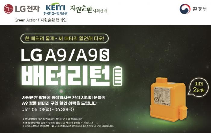 LG전자가 무선청소기 폐배터리의 자원순환에 앞장서며 ESG(환경, 사회, 지배구조) 경영을 실천한다. LG전자는 5월 8일부터 6월 30일까지 프리미엄 무선청소기 코드제로 A9과 A9S에 사용했던 폐배터리를 수거해 고객이 자원순환에 참여할 수 있도록 하고