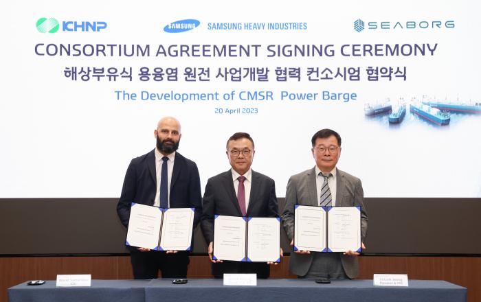 '바다 위 원전' 개발, 글로벌 원팀 만든다 삼성중공업·한국수력원자력·시보그, 3사는 용융염 원자로(CMSR)를 적용한 부유식 발전설비 제품 개발 및 사업화를 위해 컨소시엄을 구성하기로 합의했다고 21일 밝