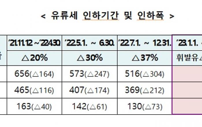 유류세 탄력세율 인하조치가 4개월 연장된다. 기획재정부는 이달 말 종료 예정인 유류세 한시적 인하 조치를 국민들의 유류비 부담 완화를 위해 오는 8월 31일까지 4개월 연장한다고 18일 밝혔다.이번 조치는 OPEC+의 원유 감산 발표 이후 국내 유류 가격이 지속