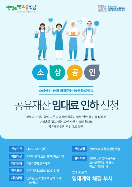 전라남도는 코로나19 장기화와 고금리고물가 등으로 어려운 소상공인 등을 위해 2022년 전남도 도유재산 임대료를 감경한다고 밝혔다.