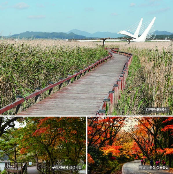전라남도는 청명한 하늘과 가을 정취에 어울리는 구례 천은사 상생의 길, 강진만생태공원, 해남 장춘숲길을‘꼭 걸어봐야 할 명소’로 선정했다고 밝혔다.