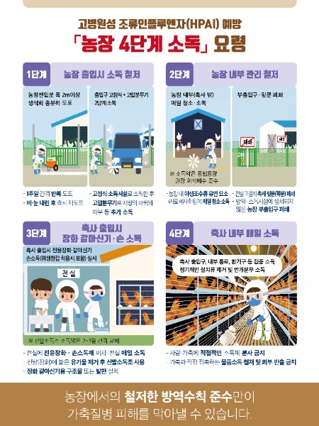 가금 사육농장과 축산 관계 시설의 종사자, 축산차량 운전자는 매일 농장과 시설, 차량 내외부를 집중 소독해야 한다. 가금농장에서는 농장 첫 출입 시 반드시 소독 후 작업을 하고, 기온이 높아 소독 효과가 좋은 오후 2~3시에 소독을 집중해야 한다.