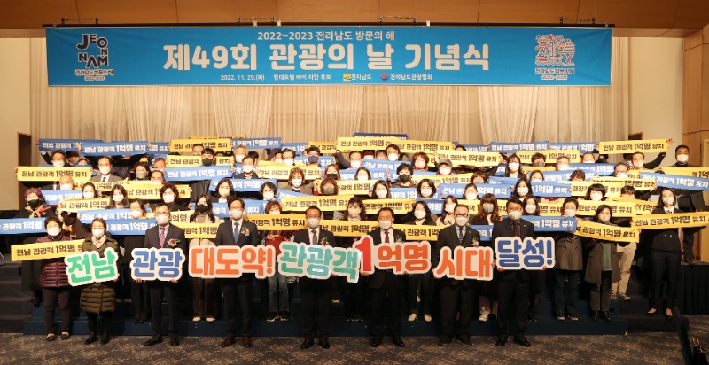 전라남도는 29일 현대호텔 바이 라한목포에서 관광산업 발전을 위해 관광인의 노고를 격려하고 전남 관광 1억 명, 해외 관광객 300만 명 달성을 다짐하는 제49회 관광의 날 기념식을 개최했다.