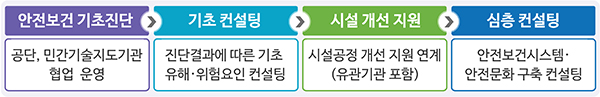 중소기업 대상 민간 재해예방기관 기술지도는 위험성평가 컨설팅으로 전환하고 시설·공정 전반의 위험요인 발굴 및 진단까지 확대 지원한다.