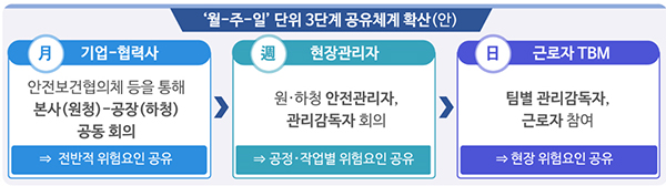 사업장별 정기·수시 평가 결과가 현장 근로자까지 상시 전달·공유될 수 있도록 ‘월-주-일 3단계 공유체계’를 확산하고, 위험성평가 결과가 현장 근로자까지 실시간 공유될 수 있도록 모바일 앱을 개발·보급한다.