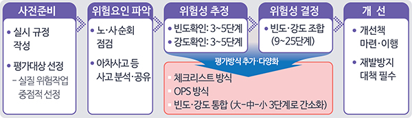 위험성평가 제도를 ‘핵심 위험요인’ 발굴·개선과 ‘재발 방지’ 중심으로 운영하고 이를 2025년까지 단계적으로 의무화한다.