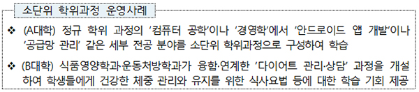 교육부는 유망산업과 융합학문 등 다양한 전공의 세부 분야에 대한 교육 기회를 제공해 학습 선택권을 보장하고 이수 부담을 완화하기 위한 소단위 학위과정 운영의 법적 근거를 마련키로 했다.