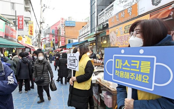 ▲ 서울시 동작구 남성사계시장에서 상인회 관계자들이 마스크 착용 및 설 명절 가족 간 사회적 거리두기를 알리는 캠페인을 진행하고 있다. [사진제공=동작구]