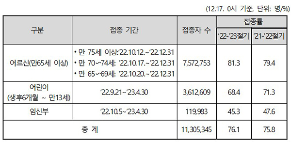 ▲ 2022-2023절기 인플루엔자 예방접종 현황. [자료=질병관리청 제공]