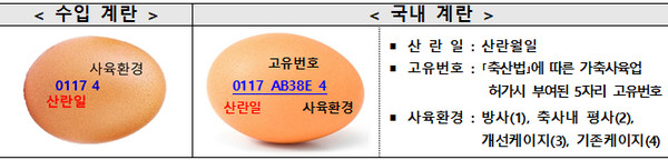 국산 달걀은 껍데기(난각)에 10자리(산란일자+농장 고유번호+사육환경) 숫자가 표시돼 있고 수입산은 농장고유번호 없이 5자리(산란일자+사육환경) 숫자가 표시돼 있어 수입산 여부 등은 쉽게 확인이 가능하다.