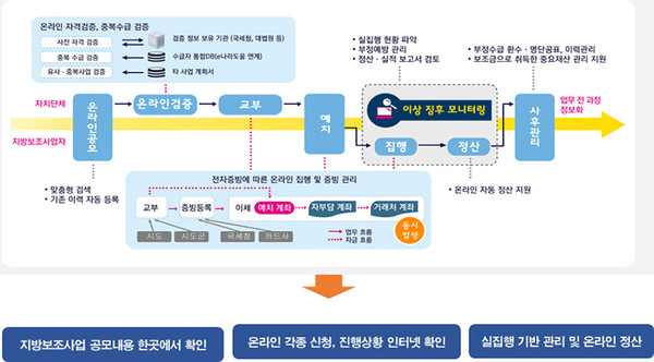 243개 자치단체에서 대장으로 관리하고 있는 보조금 관리 정보를 통합하고, 유관 시스템과 연계해 중복·부정 수급을 예방할 수 있는 온라인 검증 체계를 갖췄다.