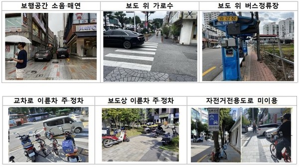 특히 생활도로에서는 불법 주·정차와 적치물로 실질적 보도 폭이 좁아져 보행자들이 위협을 느끼는 것으로 조사됐다.