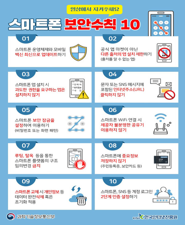 과기정통부와 한국인터넷진흥원은 설 연휴기간 문자사기 유포 등에 신속 대응할 수 있도록 상시 감시체계를 운영한다. 신고·접수된 스미싱 정보를 분석해 악성앱 유포지 차단 등 신속한 조치로 피해를 최소화한다는 계획이다.