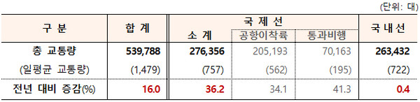 또 입국자 격리 해제와 함께 동남아·미주에 이어 일본으로까지 하늘길이 넓어지면서 지난해 국제선 항공 교통량은 전년 대비 36% 증가한 27만 6356대를 기록했다.