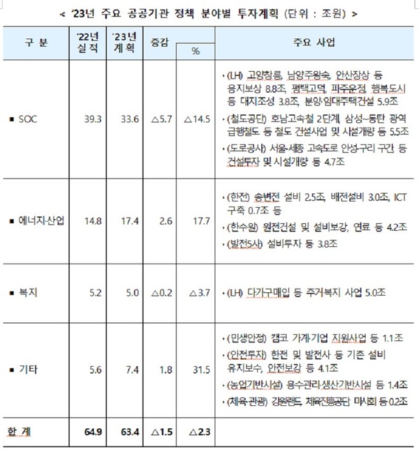 주요 공공기관이 올해 63조 4000억 원을 사회간접자본·에너지·주거복지 등에 투자한다.
