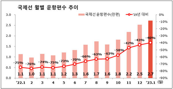 1월 국제선 항공 운항편수, 코로나19 이전 60% 회복