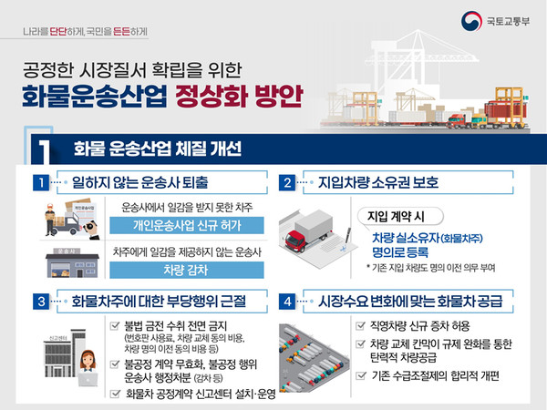 ‘화물운송산업 정상화 방안’은 ▲화물 운송산업 체질 개선 ▲화물차 안전운임제 근본적 개선 ▲화물차주 처우 개선 ▲화물차 교통안전 실질적 강화 등을 골자로 한다.