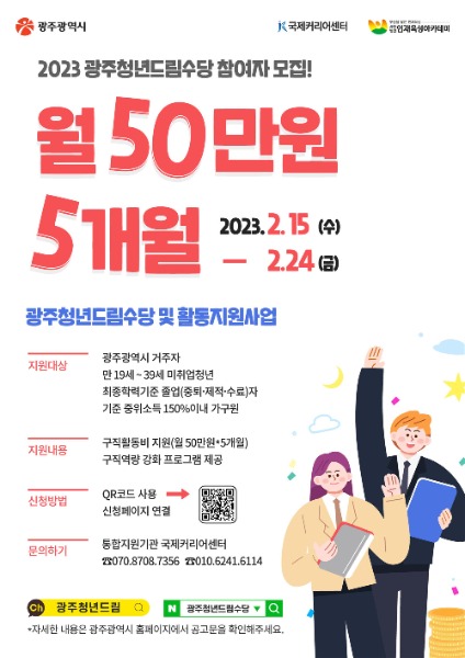 모집대상은 광주시에 주민등록상 주소지를 두고 있는 만19~39세의 최종학력 졸업(중퇴·제적·수료)자로, 기준 중위소득 150% 이내 구직활동 의지가 있는 미취업 청년이면 가능하다.(학생·휴학생·졸업예정자는 제외)