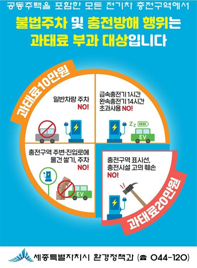 세종특별자치시(시장 최민호)는 2022년 1월 28일부로 친환경자동차법이 개정 시행되면서 전기차 충전구역 내 불법주차 시 과태료가 부과되고 있다고 14일 밝혔다.