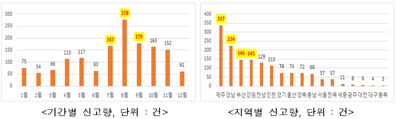 신고자료 분석 결과에 따르면 지난해 제주, 부산·경남 지역에서의 신고가 다른 지역에 비해 많은 것으로 나타났다. 시기별로는 겨울철 제주지역과 여름철 강원지역에서의 신고량이 두드러졌다.