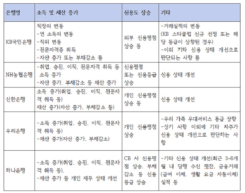 주요 시중은행들이 자사 누리집에 공개한 금리인하 요구 사유는 대체로 비슷하다. 취업이나 승진, 이직, 전문자격 취득 등을 통해 소득·재산이 늘어났거나 부채 감소로 자산이 증가한 경우가 대표적이다. 신용평가회사의 개인신용평점이 개선됐을때도 금리인하요구권을 행사 할 수 있다.