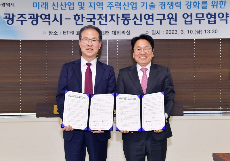 광주광역시(시장 강기정)는 10일 광융합·인공지능(AI)·모빌리티 등 지역 주력산업의 기술 고도화 및 미래 산업환경에 대응한 지속 성장을 위해 ETRI와 업무협약을 체결했다.