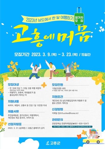 고흥군은 체류여행 프로젝트인 2023 남도에서 한 달 여행하기 '고흥에 머뭄' 참가자를 모집한다고 밝혔다.