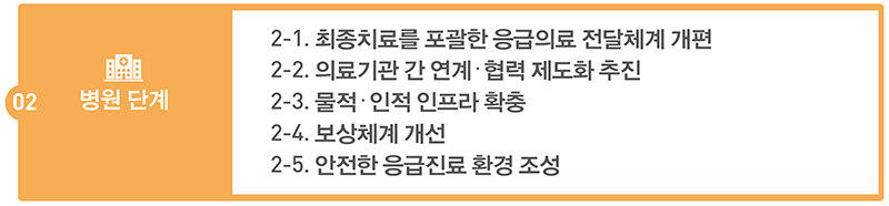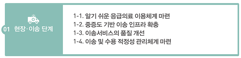 특히 이송의 신속성과 적정성을 강화하기 위해 현장과 병원 간 환자 중증도 분류기준을 통일해 구급대의 이송병원 선정 역량을 강화하고, 응급구조사의 업무 범위를 확대하여 이송 중 필요한 처치를 적시에 제공한다.