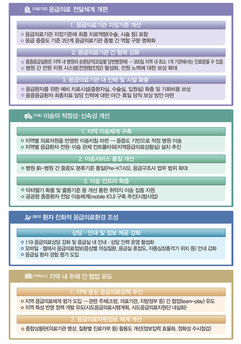 지금까지 정부는 3차에 걸친 응급의료 기본계획을 통해 응급의료기관 종별 체계 구축, 닥터헬기 등 이송 기반(인프라) 강화, 권역외상센터 확충 등 응급의료 전 영역에 걸친 대응체계를 지속적으로 발전시켜왔다.
