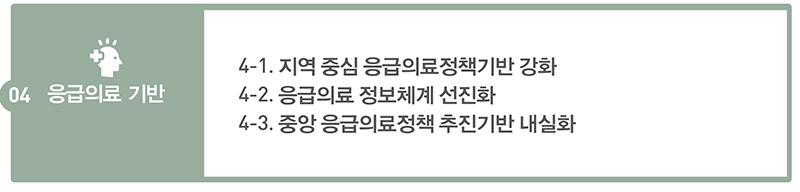 이에 응급의료정책의 변화가 필요한 현시점에서 제4차 기본계획은 ‘전국 어디서나 최종치료까지 책임지는 응급의료’를 비전으로, ‘지역 완결적 필수·공공의료 구축’ 국정과제 실현을 위한 4개 분야, 17개 중점과제로 구성되었다.