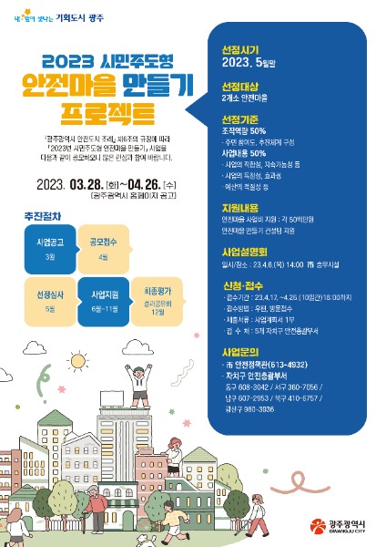 광주광역시(시장 강기정)가 ‘언제 어디서나 안전도시 광주’를 실현하기 위해 4월26일까지 ‘시민주도형 안전마을 만들기 프로젝트’를 공모한다.
