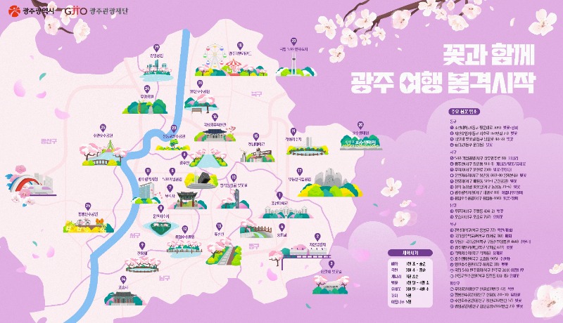 지도에는 ▲벚꽃(운천저수지,우치공원, 수완호수공원) ▲유채꽃(황룡친수공원) ▲목련, 매화(전남대학교) ▲장미(조선대학교, 풍암호수공원) ▲이팝(국립5·18민주묘지) 등의 주요 명소가 담겼다.