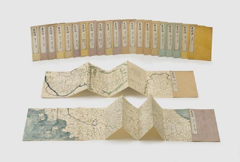 우리나라를 남북으로 120리 간격으로 구분해 22층을 만들고, 각 층을 병풍식으로 접을 수 있는 첩으로 만든 것은 동여도와 대동여지도가 같다.