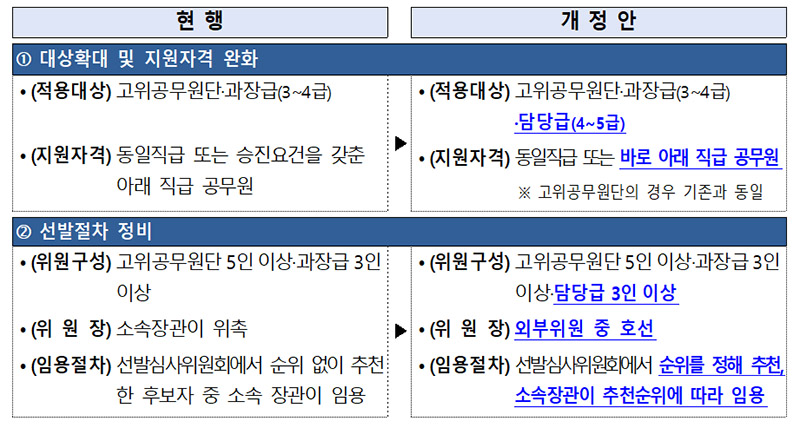 개정안에 따르면 공모 직위 대상은 고위공무원단·과장급에서 5급 사무관(이하 담당급 직위)까지로 확대된다. 바로 아래 직급도 지원 가능하도록 직급 제한이 완화된다.