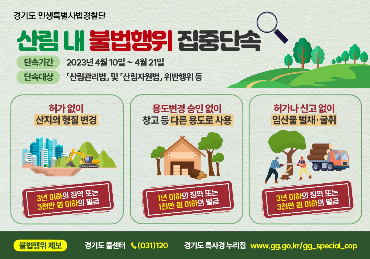 경기도 민생특별사법경찰단은 4월 10일부터 21일까지 산림 내 불법 훼손 행위를 집중 단속한다.