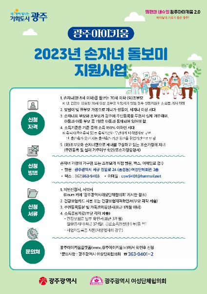 ‘손자녀돌보미 지원사업’에 대한 자세한 내용은 광주아이키움플랫폼(www.광주아이키움.kr) 또는 사업 수행기관인 광주시여성단체협의회(062-363-9401~2)를 통해 확인할 수 있다.