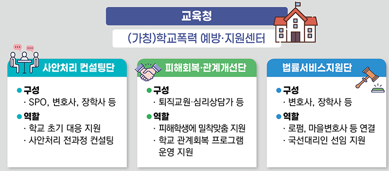학교 현장에서 교사들이 적극적으로 학교폭력 사안에 대응할 수 있도록 17개 시도교육청에 ‘(가칭)학교폭력예방·지원센터’를 설치·운영해 학교 현장의 사안 처리, 가·피해학생 간 관계회복, 법률서비스 등을 지원한다.