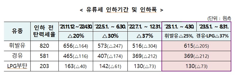 이번 조치를 통해 휘발유 유류세는 ℓ당 820원에서 615원으로 205원 낮아진다. 경유 유류세는 581원에서 369원으로 212원, 액화석유가스(LPG) 부탄은 203원에서 130원으로 각각 낮아지는 효과가 4개월간 유지된다.