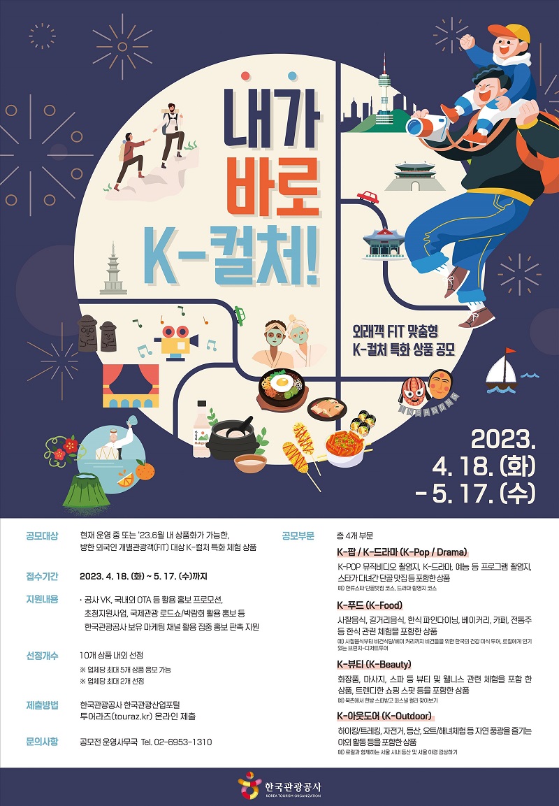 박종책 문체부 관광정책국장은 “전 세계 1억 7000만 명의 K-컬처 팬덤은 K-관광의 잠재수요”라며 “이번 공모전을 통해 관광과 K-컬처의 독보적이고 매력적인 융합을 보여줄 수 있는 다양한 상품이 발굴돼 K-관광수요를 잡을 수 있길 바란다”고 밝혔다.