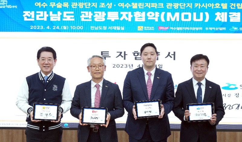 전라남도는 24일 도청 서재필실에서 모아그룹, ㈜여수레저개발, 여수챌린지파크관광(주), 두제이산업(주)과 여수 무술목 관광단지 조성, 챌린지파크 관광단지 호텔 건립을 위한 1조 원 규모 관광 투자협약을 했다.