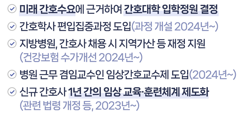 또한 미래 간호수요 증가에 맞추어 한시적으로 간호대학 입학정원을 계속 늘리고, 간호대학 학사편입제도를 ‘간호학사 편입집중과정’을 중심으로 재편될 수 있도록 지원한다.