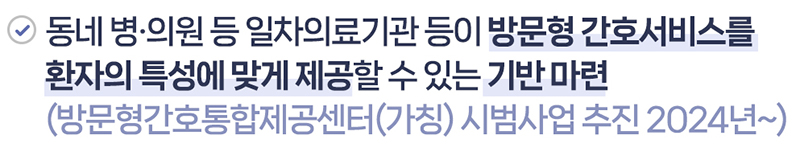 먼저 의료법상의 가정간호, 장기요양보험법상의 방문간호 등 다수의 방문형 간호서비스를 하나의 기관에서 대상자의 특성에 맞게 제공하는 모형을 마련한다.