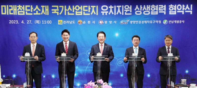 전라남도는 27일 광양만권경제자유구역청 회의실에서 순천시, 광양시와 이차전지, 수소, 기능성 화학 등 미래소재 산업 육성을 위한 ‘미래첨단소재 국가산업단지 지정 상생협력 업무협약’을 했다.