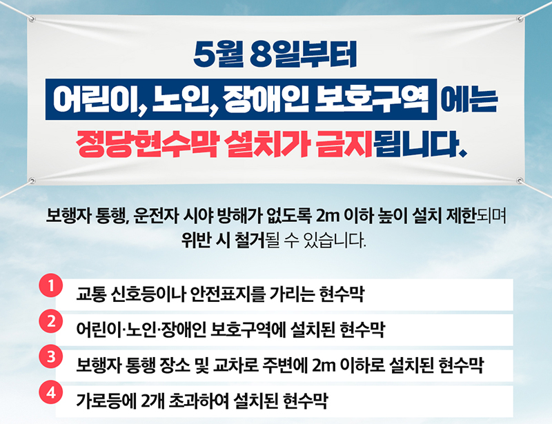 앞으로 정당현수막으로 인한 안전사고 예방을 위해 어린이·노인·장애인 보호구역에 정당현수막 설치를 금지하고, 2m 이하 높이에도 설치를 제한한다.