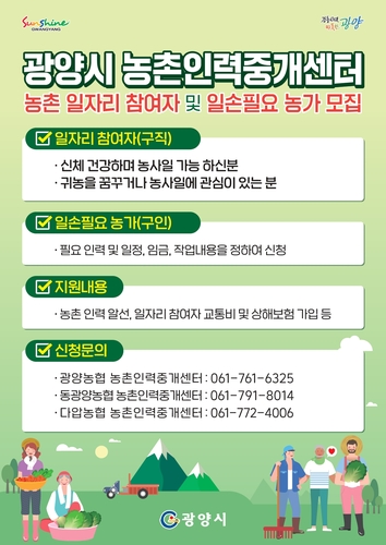 일손이 필요한 농가와 농작업 참여를 희망하는 구직자는 광양농협, 동광양농협, 다압농협 농촌인력중개센터에 신청하면 된다.